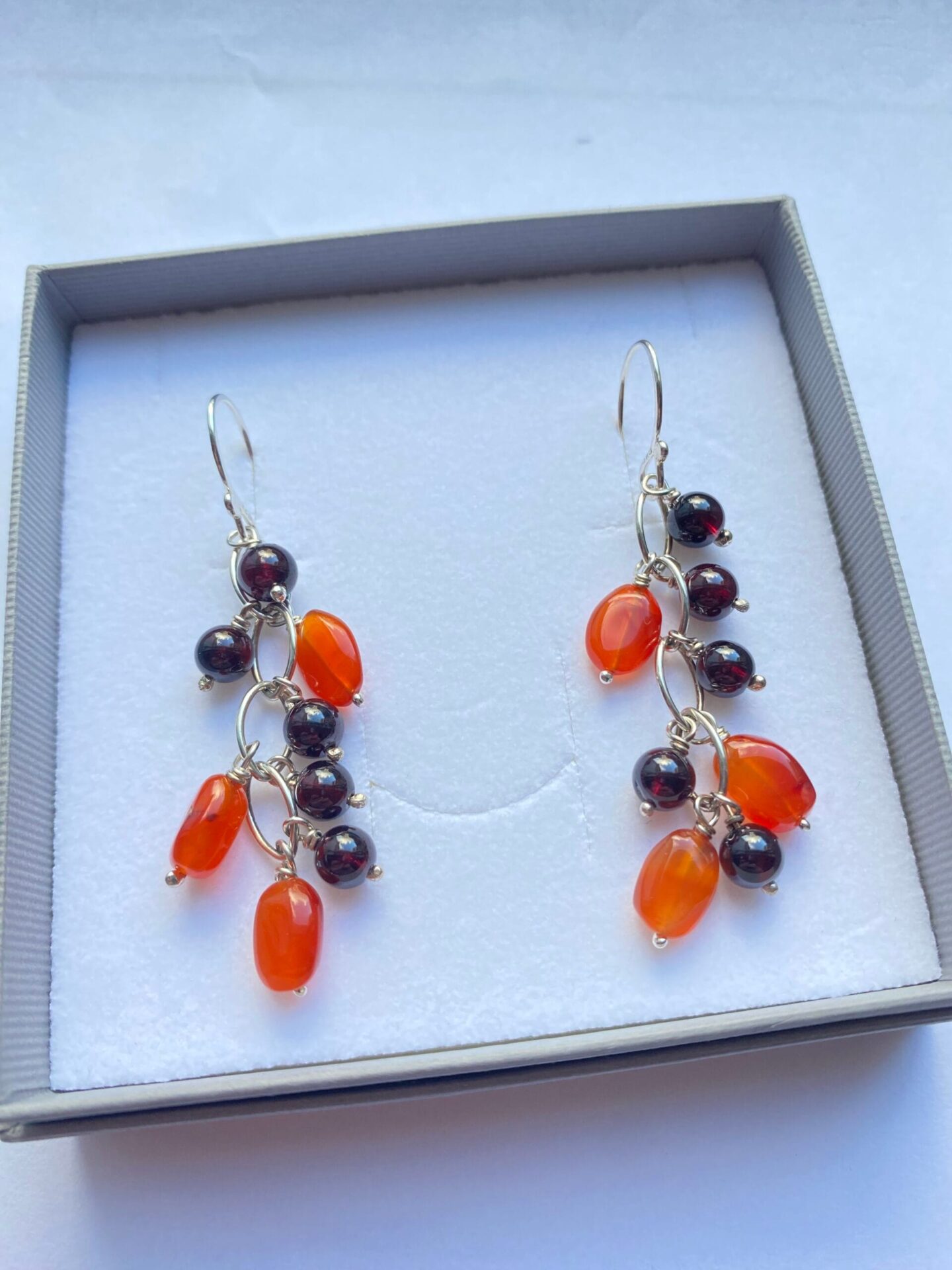 My best selling waterfall cluster earrings with carnelian and garnet. Hand made ear hooks. Five deep red garnets complemented with three carnelians, cascading from silver navette style links with hand made bobbled wires.