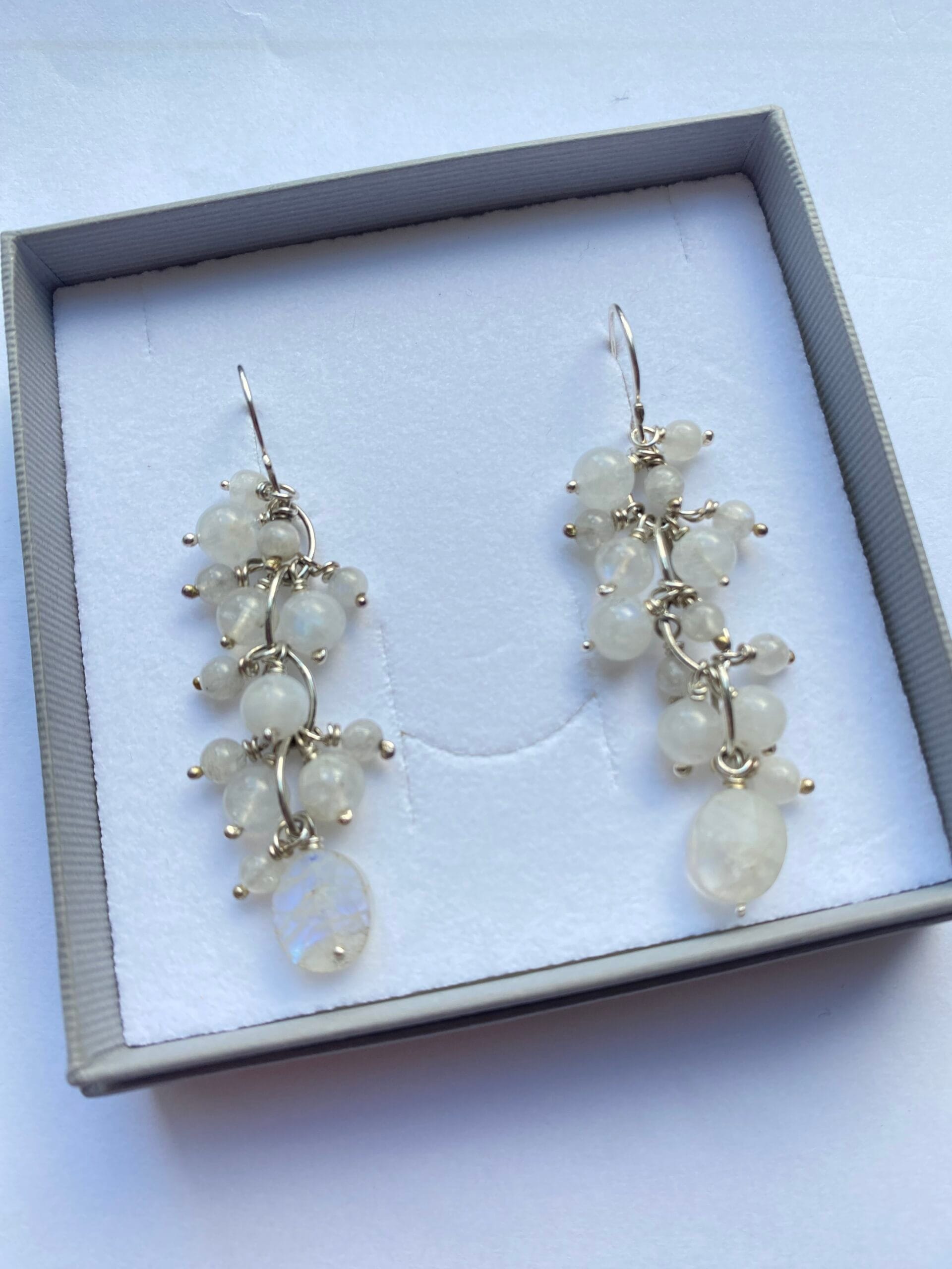 My best selling waterfall style moonstone cluster earrings. Hand made ear hooks. Fifteen moonstones cascading from silver navette style links with hand made bobbled wires. Finished with a faceted moonstone.